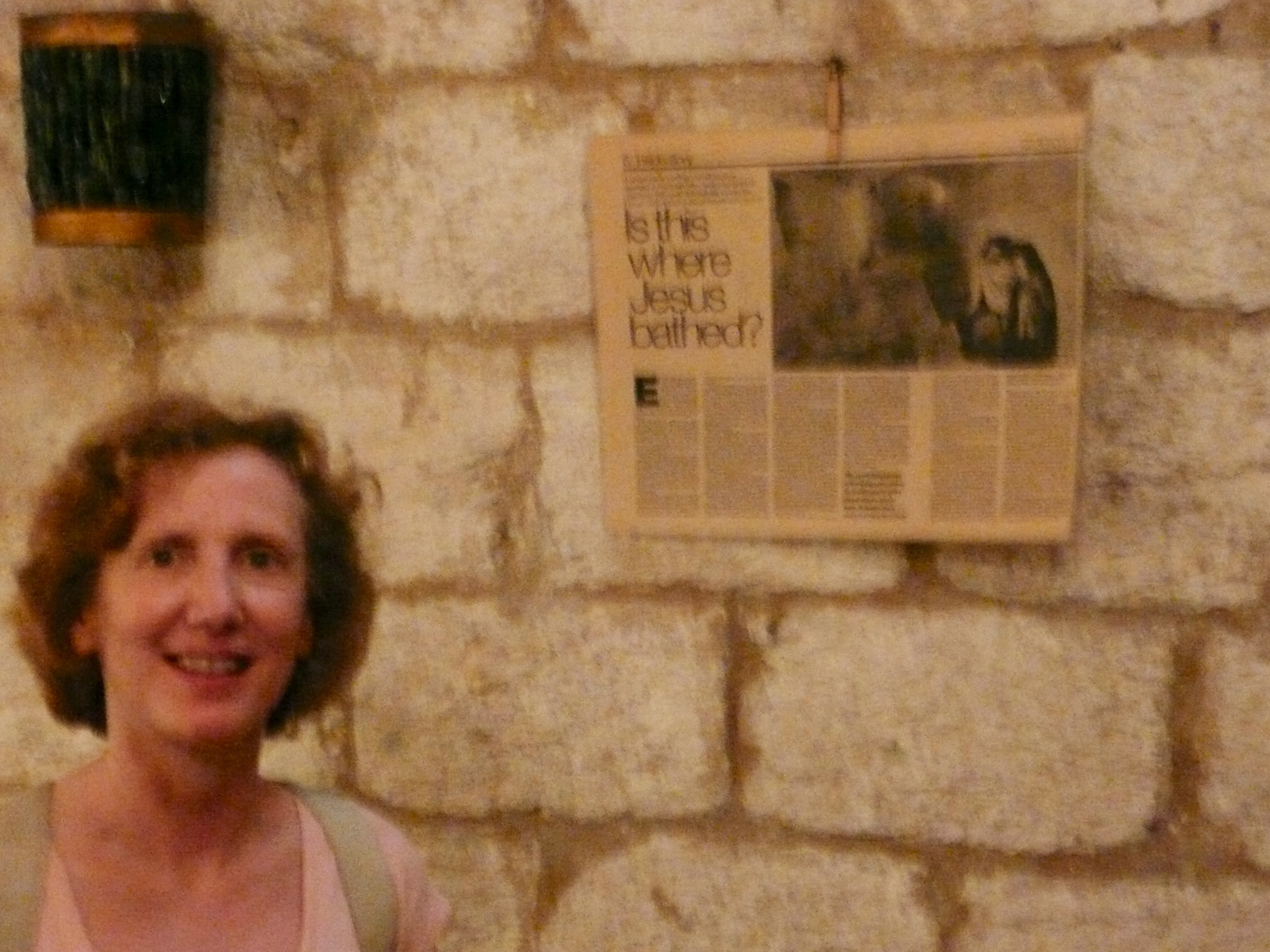 After our orientation we wander down into the centre of Nazareth with May. We grab a bite to eat at one of the numerous food outlets. I opt for a ‘falafel’ which is like an open sandwich stuffed with all sorts of local produce. I haven’t got a clue what is in it, but it is yumacious! After our ‘on the hoof’ lunch, May takes us round the various local sites of interest. We visit Mary’s Well, the Greek Orthodox Church of the Annunciation, the Roman Catholic Church of the Annunciation, and the recently discovered site of an ancient Roman bathhouse that dates from the time of Jesus where we are assured that ‘Jesus washed here!’ Some of these sites we have seen before, but it is so good to be back. Somehow they seem to mean more to us this time. Perhaps it is because we have more time, or maybe it is because I understand the geography and the places better than when we were last here? As per usual I take loads of photographs … even though I probably have similar photos of the same places back home – photos I took eight years ago when we were last here!?