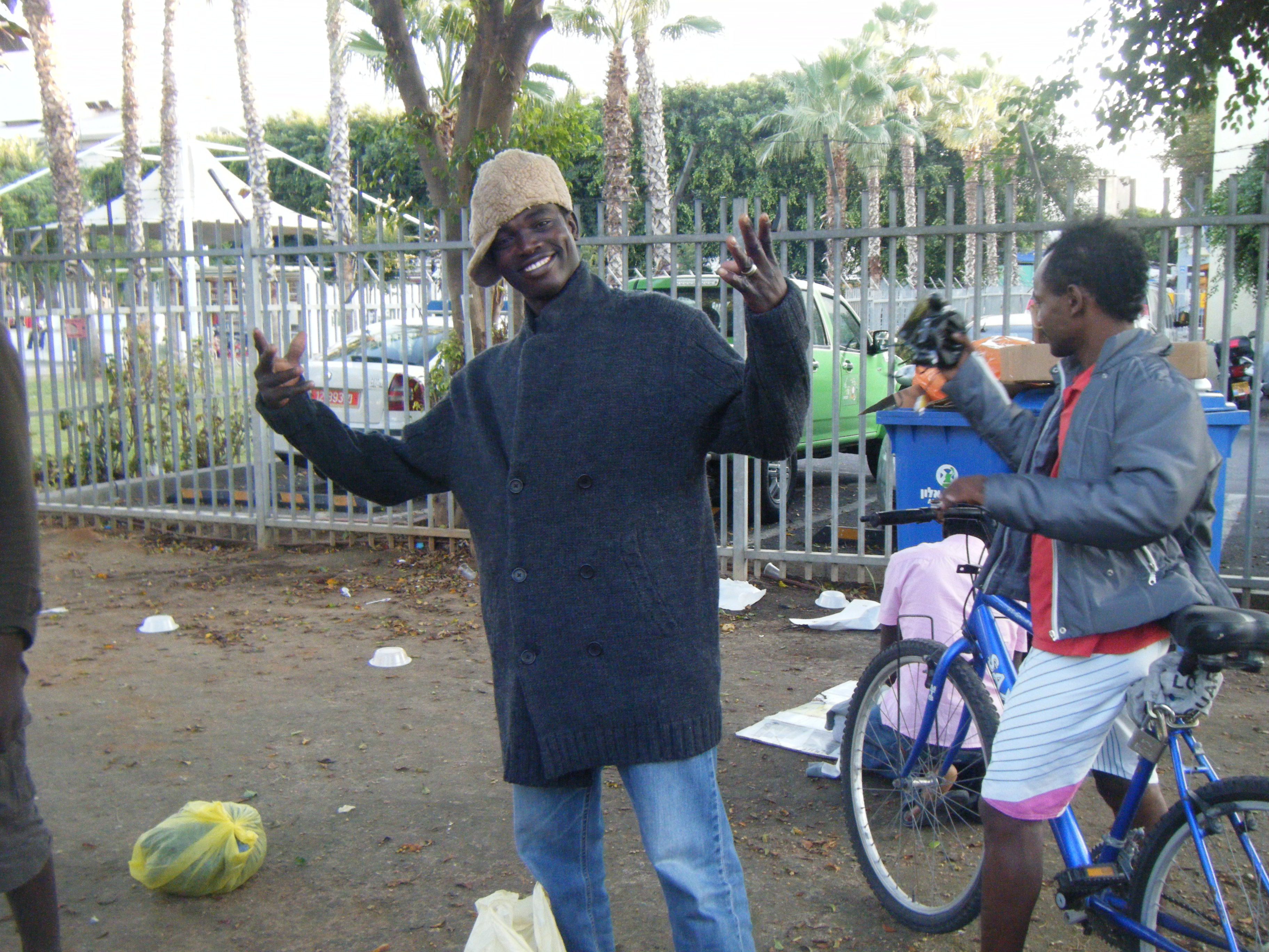 Tel Aviv is quite a long way away and it takes us about an hour and a half to get to Levinsky Park in the centre of the city. People gather here, stretched out on the grass chatting or just mooching about, not just Sudanese but other North Africa such as Eritreans as well. There are also Nepalese, Indian and Fillipinos and all sorts of other nationalities. They come to Israel to find work and if they do, it is always the most menial and lowest the Israelis don’t want to do – same as in London and numerous other places in the world. They are greatly in need. We start by walking all round the park praying. We then stand and pray together. I am glad I am not on my own here. Bishara has been doing this for years. We then set up the tables and unpack the literature and haul the bags of clothing over to try to arrange things are neatly as we can. We are then descended upon by hordes of men who scavenge through the clothes to find anything that might be useful. Within seconds the clothes are all over the place. We have fun with some of them and try to help them find what they need. One guy, after having found a warm coat, reckons all he needs is a hat to finish off the outfit. I find one for him and he puts it on in a jaunty fashion. All the guys around him are in fits of laughter.