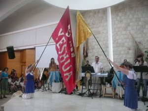 The worship area is packed, and the worship is very lively with a good music group leading us in some lively worship songs. There are two very good female dancers who also take part making good use of tambourines and flags and capes. It is very charismatic and the joy is infectious. About 20 minutes into the worship the two dancers grab hold of all the children in the congregation … and some more adults … and off they go dancing round and across the platform area conga style. I now understand what Jo was on about. The kids absolutely love it and it is great fun to watch as well. We worship for an hour or so … mostly through the use of song but with some prayer inserted as well. There is quite bit of information sharing before the children go out to their groups, and there is some more singing before we get to the preaching. There are a lot of Russian Jews in this particular congregation so the sermon is in Russian, and a lady translates it into Hebrew, and it is also translated into English via headphones for us English speakers. The sermon lasts 45 minutes and is on the theme of ‘booths’ (since it is the end of the Feast of Tabernacles). It takes the preacher 20 minutes to actually get to any passage of scripture … and then he refers to virtually every reference to ‘booths’ in the Bible. It is a rather a complex sermon but at the end of it the preacher issues an altar call and quite a lot of people come forward for prayer. The whole service lasts two and a half hours.