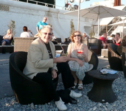We stop off at one of the beach restaurants for a cocktail … Julia doesn’t want to wait for her actual birthday ‘day’ and tells me that the whole ten days we are here is in fact her ‘birthday’! It is very posh and we sit in some nice chairs right by the beach. I decide I have had enough ‘Sex on the Beach’ to last a life time and order a ‘Mojito’ – an interesting blend of mint, lime, rum etc. It is very nice but not really worth what I pay for it. Julia has gone off the idea of a cocktail and settles for a Campari instead. The service is atrocious and we wait ages to be served. We do have a nice chat to a group of Asian girls from north London, in the meantime, who are also here to celebrate a significant birthday for one of them!