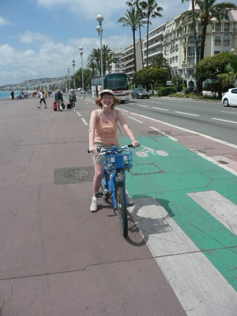 It is great fun cycling back to the centre of Nice. For a start it is down hill most of the way! When we get back to the main beaches area we have to stop so that Julia can go for a swim in the Mediterranean Sea. We park the bikes by some of the famous ‘blue seats’ that are all along the sea front. I am on ‘bag and bike guarding duty’ as Julia goes down to the sea, slips into her swimming costume, and dives in! A coach load of Italian tourists pull up right by where Julia is swimming. They all get out of their coach and go down to the beach to watch Julia swimming. Is this because she looks ravishing in her swimming costume? Is it because of the elegant way Julia is swimming? Or is it because Julia is swimming in an area of beach where the red flags are out to say ‘No swimming!’ here?