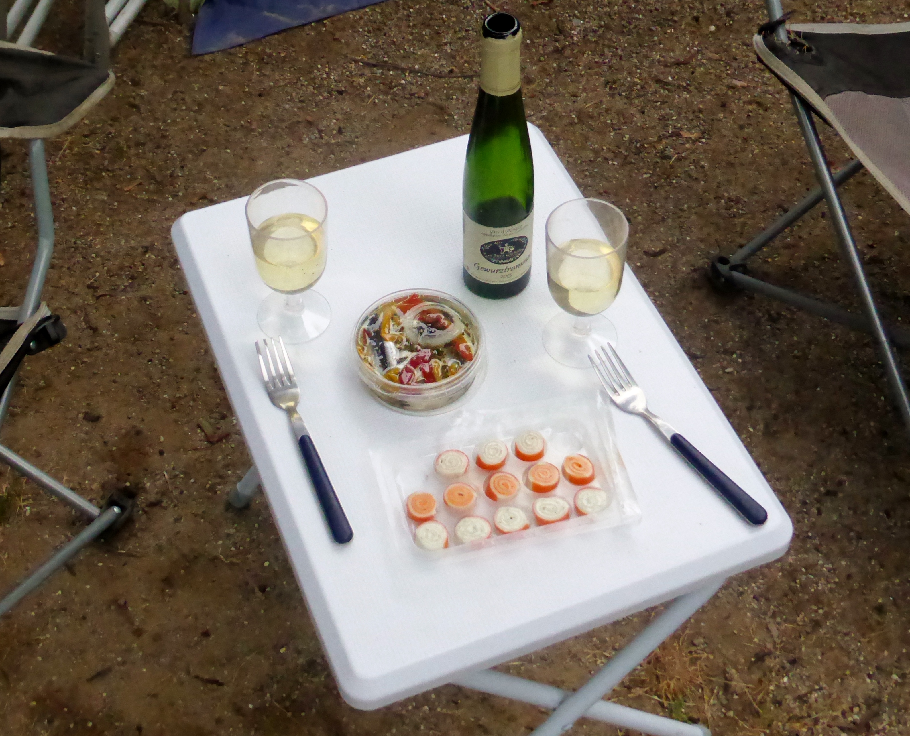 Eventually we make it out the other side of the town. We are so stressed by the experience that we abandon our quest to buy some quality wine from one of the many Wine domains we pass on the way to the supermarket. We do our ‘big shop’ and then head back to our campsite sans wine. We are having fish for dinner … grilled on our wonderful new portable gas burner with fancy grill plate that we bought for overnight stops but find ourselves using in addition to our normal larger gas cooker. ‘It would have been good to have had some really nice quality wine from Alsace to go with the fish?’ we think. So Julia walks up to the shop attached to the local Vineyard at the top of the road. She comes back with a half bottle of locally produced white wine … and very good it is, too!