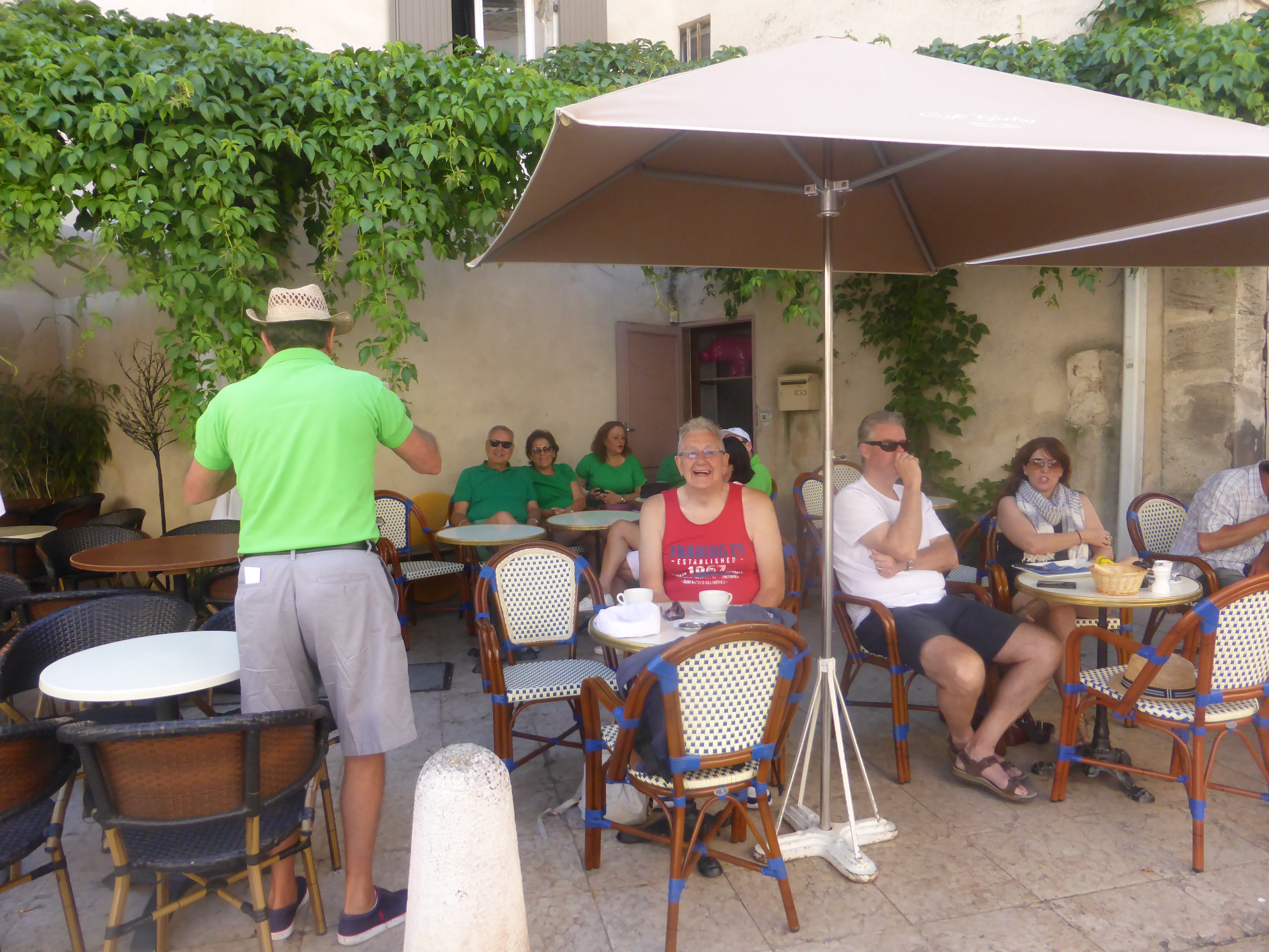 We wander round Lourmarin, surveying the town and getting a good sense of what there is to see here. The shops are very expensive. Julia wants to buy a bag for all our swimming stuff that she can take to the campsite pool … but they are so expensive. We stop for a coffee …which is surprisingly cheap … and are immediately confronted by a party of tourists all wearing green shirts!? The leader has a whistle which he repeatedly blows to call the party to order. Half way round his party rebel and come and sit in the same café as us. They need coffee … and omelettes! It turns out that they are from Mexico. They do not speak any French … and the waiter does not speak any Spanish? The ordering of the omelettes is hilarious … some want ham (ham not jambon), some want cheese, some want different types of cheese? The Mexicans find it all very funny … the waiter is tearing his hair out!
