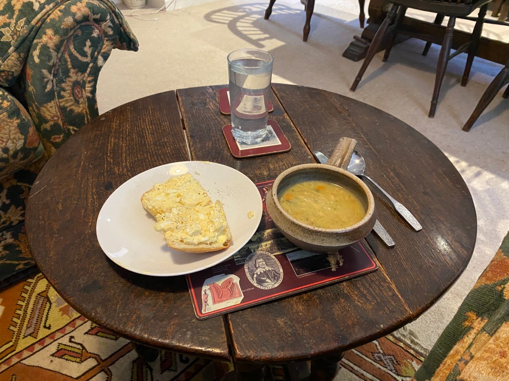 So … there will be no huge Sunday Lunch this Sunday. We are here to help look after Olivia and spend some time with her, so no visit to a local eatery is on the cards today. I do think about nipping up the road to the Horseshoe Inn in Ebbesbourne Wake – they have an excellent reputation for good food – but I don’t think I would get away with it. And … I remember that I have to ‘resist temptation’! Besides, Julia is cooking dinner for us tonight, and she is an excellent cook, so I need to leave room for that! So, a simple meal it is … a bowl of delicious chicken soup and an egg mayonnaise roll, all washed down with a glass of … water!