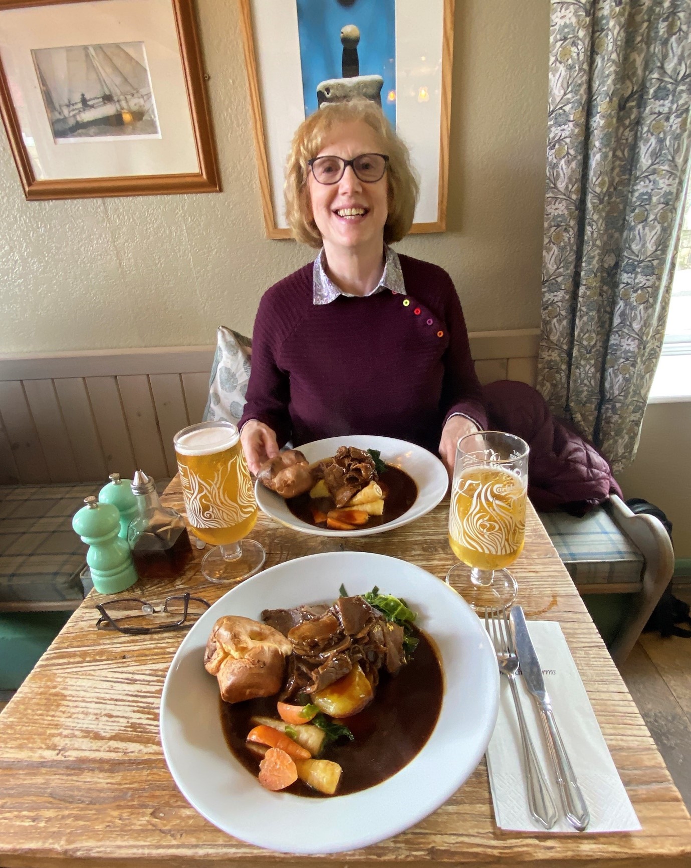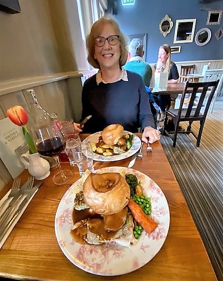 After our coffee and conversation, it was time for Sunday lunch, so it was off to The Griffin, a popular pub-restaurant in historic Caversham on the north bank of the River Thames close to Caversham Bridge where Julia had booked us a table. Pilgrims, merchants and even armies have crossed the Thames at Caversham Bridge for centuries, and there has been a tavern on the site of The Griffin since at least the 1800’s. Rebuilt to meet the needs of modern travellers in 1916, The Griffin is perfectly located for Thames travellers and Reading residents alike. Sometimes you just know what you want so it was time to try their traditional Sunday roasts with a huge a Yorkshire pudding and unlimited gravy … and yumacious it truly was!